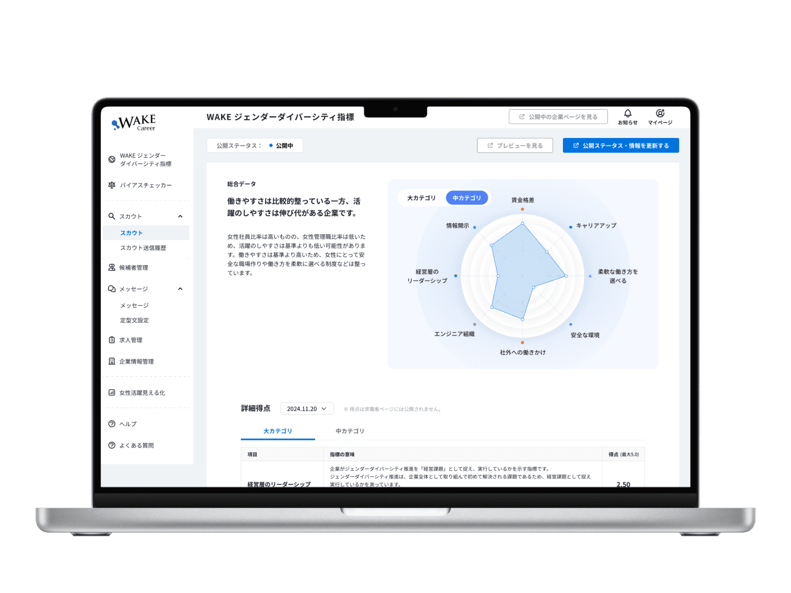 WAKE ジェンダーダイバーシティ診断で低い数値が出た場合に、求職者によくない印象を与えそうで不安です。WAKE Careerの登録者からは、「指標が低くても、WAKE Career登録企業というだけで素敵な企業と思う」「指標が低くても公開しているのが素晴らしい」との声をいただいています。また、ミスリードを防ぐために、リアルな数値は公表しておりません。